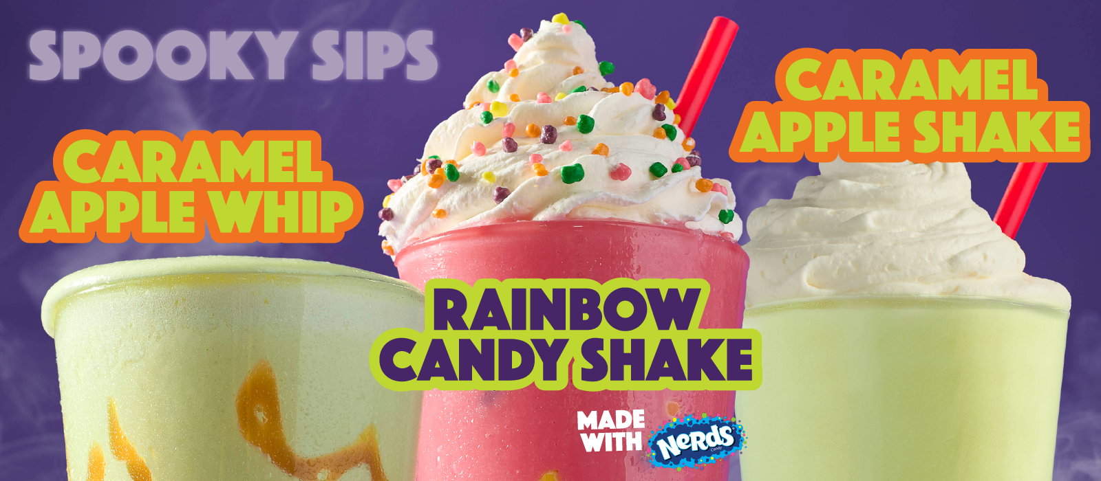 Sip on these scary good, candy-inspired flavors. The Caramel Apple Whip and Rainbow Candy Shake made with Nerds, only here for a limited time!