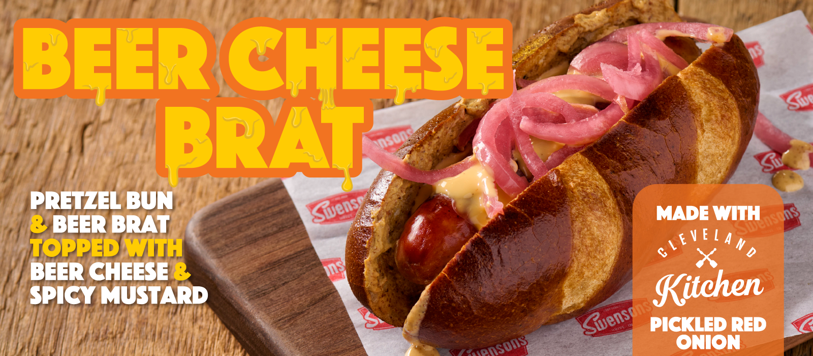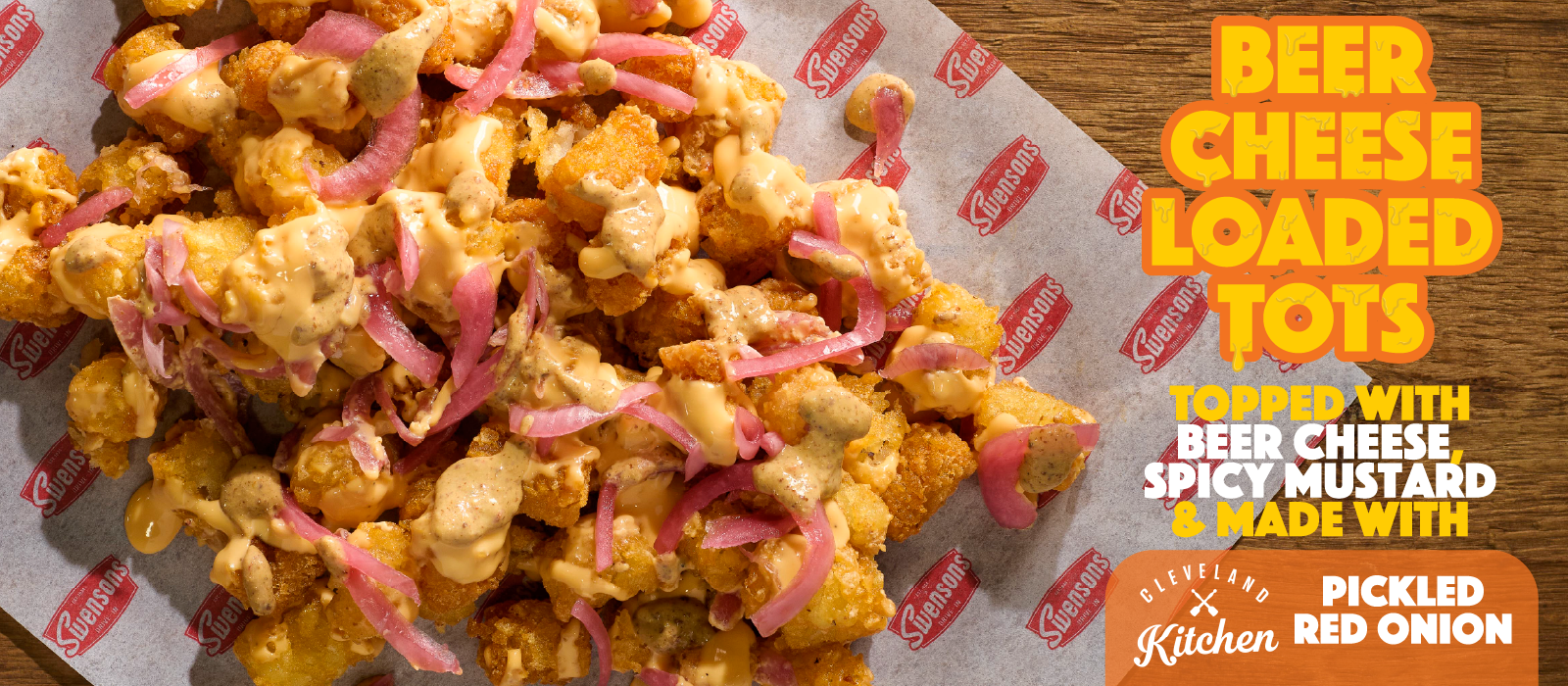 Try our Beer Cheese Brat or Beer Cheese Loaded Tots featuring melty beer cheese, spicy mustard and Cleveland Kitchen pickled onion.