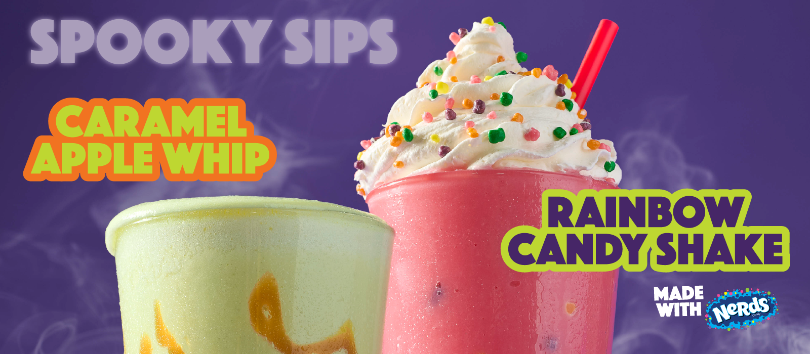 Sip on these scary good, candy-inspired flavors. The Caramel Apple Whip and Rainbow Candy Shake made with Nerds, only here for a limited time!