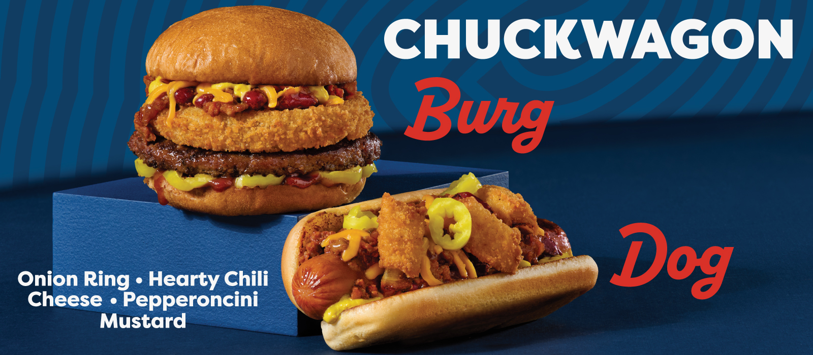 Saddle up for January’s Chuckwagon Burg or Dog, loaded with chili, cheese, crispy onion rings, tangy pepperoncini and more!
